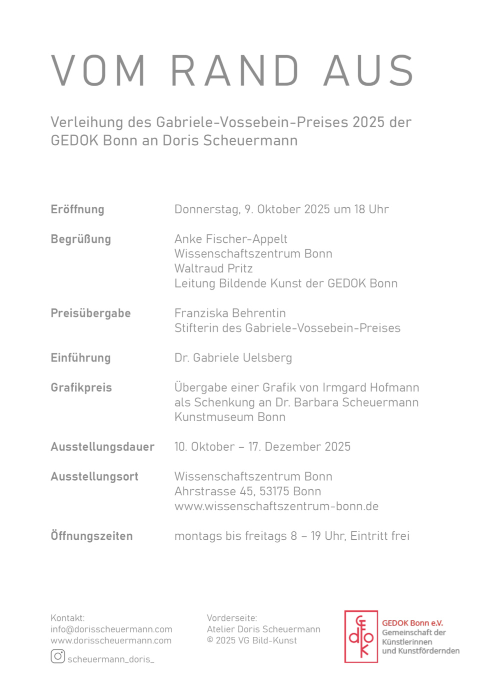 Die Ausstellung VOM RAND AUS von Doris Scheuermann findet anlässlich der Preisverleihung des Gabriele-Vossebein-Preises 2025 der GEDOK Bonn im Wissenschaftszentrum Bonn statt.